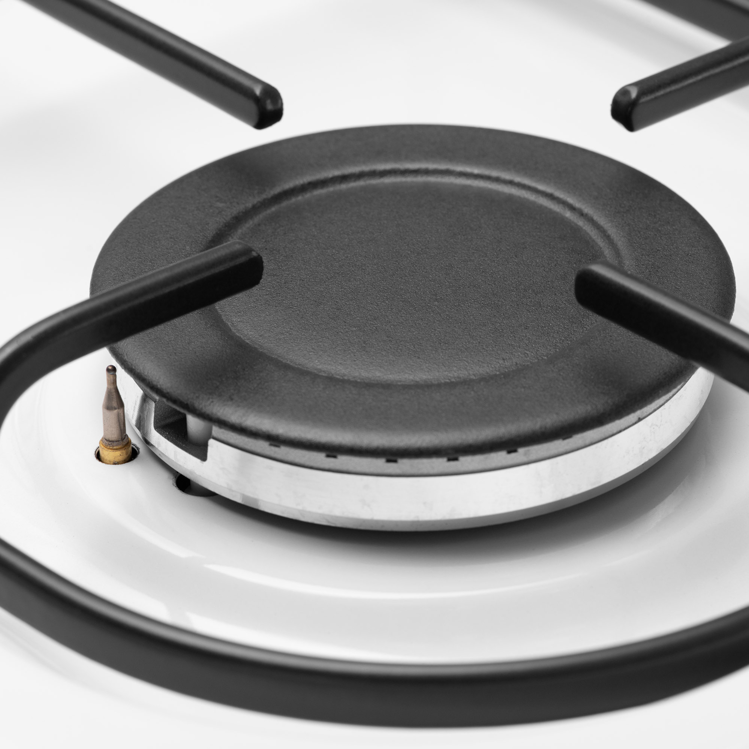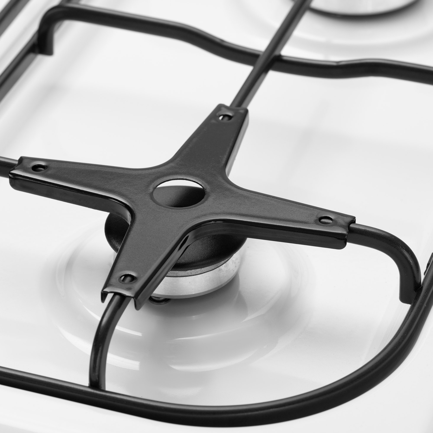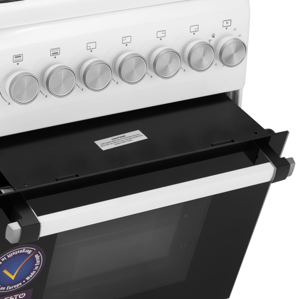 Плита належить до класу захисту I та категорії II2H3B/P, працює за напруги 220–240 V із частотою 50–60 Гц. Запалювання електричне за допомогою кнопки – просто та зручно, без сірників чи зайвих маніпуляцій. Система газ-контролю, яку вбудовано в усі конфорки поверхні та пальники духової шафи, миттєво припиняє подання газу в разі згасання полум’я, гарантуючи безпеку. Решітки вкрито матованою емаллю – міцні та зносостійкі, їх легко очистити після готування.