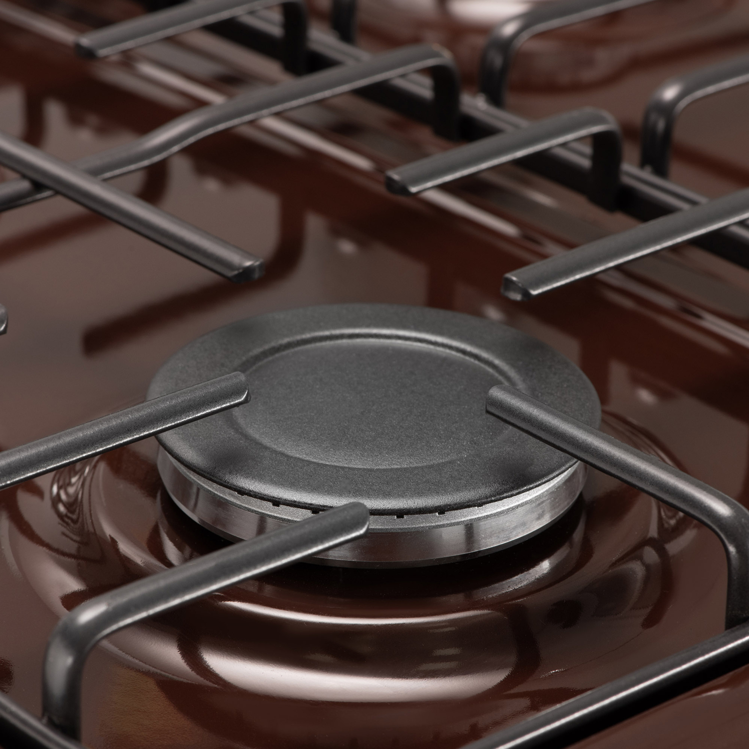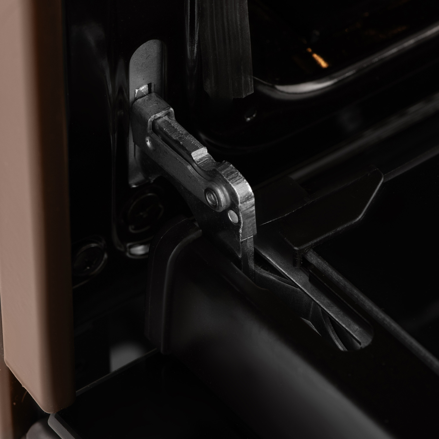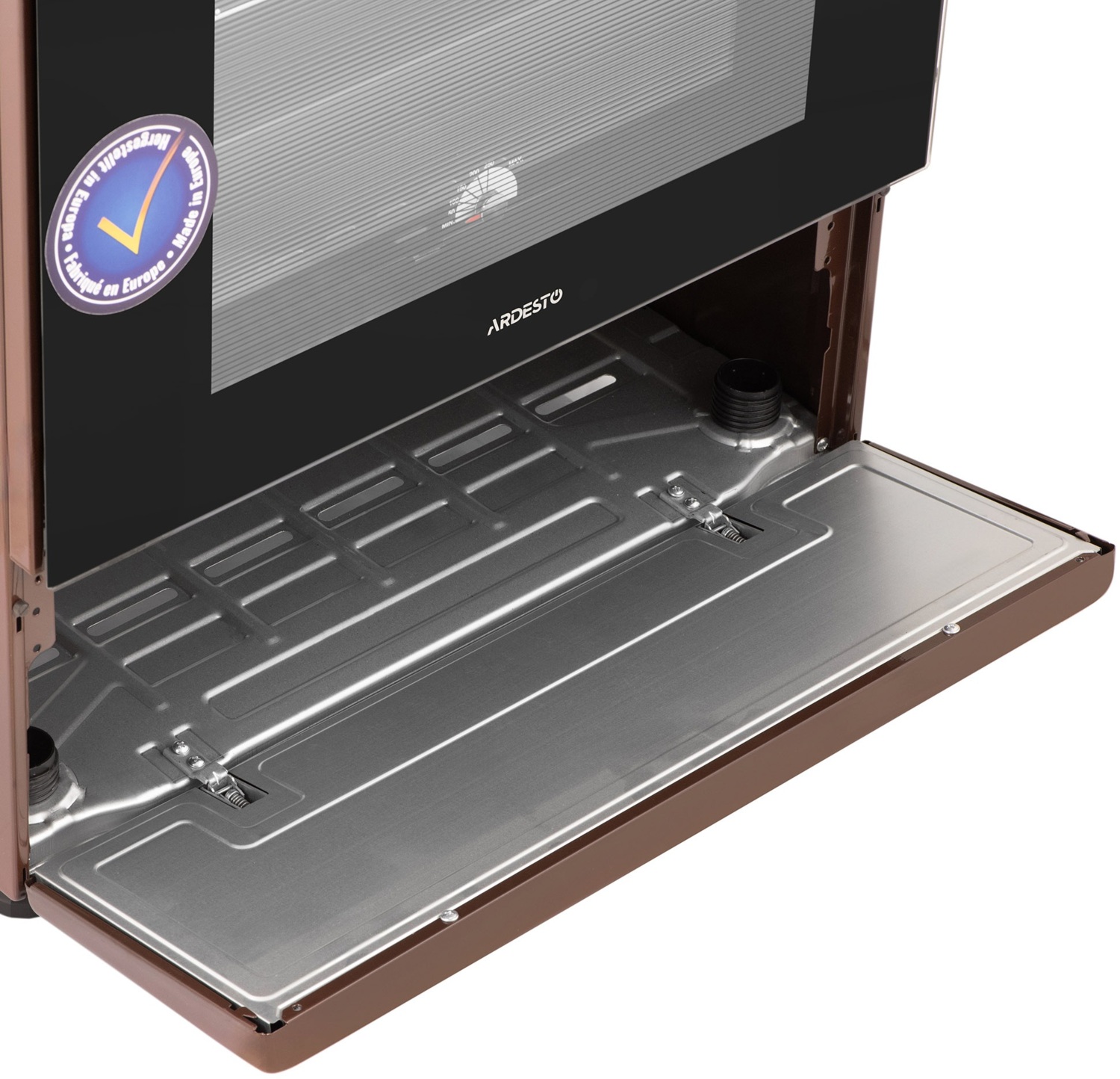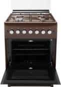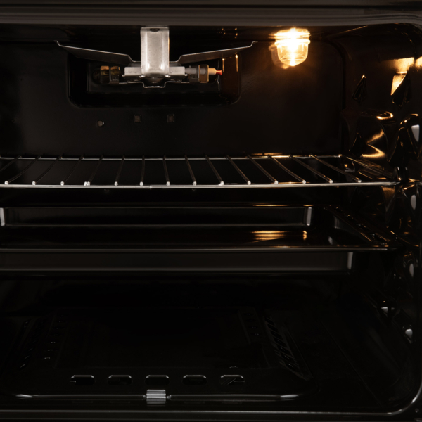 Газова духова шафа має об’єм 58 л та два нагрівальні елементи – нижній (2,75 кВт) та верхній (2,2 кВт). Завдяки п’ятьом рівням рельєфних напрямних можна регулювати відстань до джерел тепла, розміщуючи страви на оптимальній висоті для рівномірного готування – від хрустких круасанів до запеченого м’яса. Внутрішню камеру вкрито емаллю легкого очищення, що спрощує догляд. Вбудоване підсвічування дає змогу контролювати процес готування без потреби відчиняти дверцята. Дверцята мають два термостійких скла, які утримують тепло всередині, сприяючи енергоефективності й підвищуючи безпеку. Крім того, конструкцією передбачено можливість зняти внутрішнє скло дверцят, тож очистити плиту після готування – не проблема. Для зручності є механічний таймер та аналоговий термометр – традиційні, але надійні помічники для точного контролю кулінарних процесів.