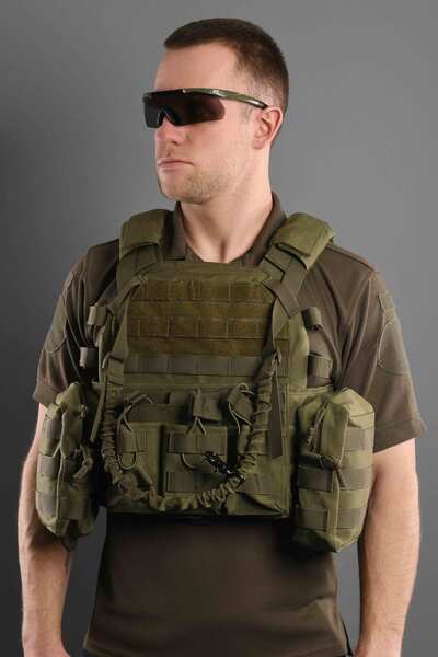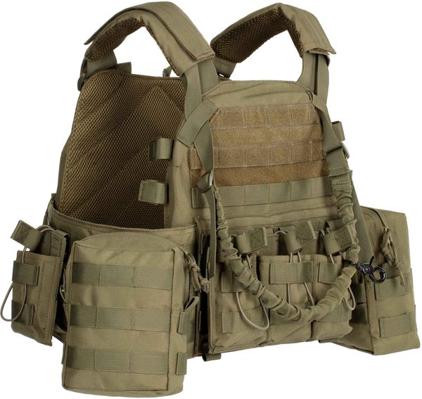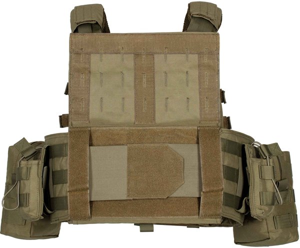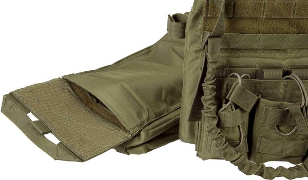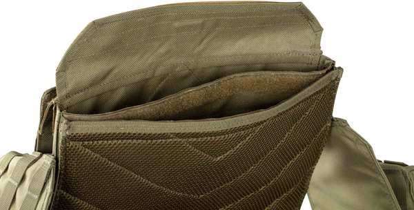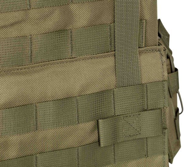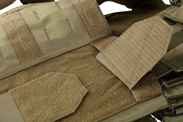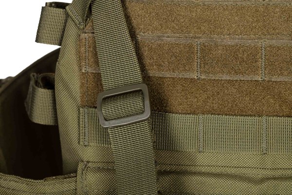 Плитоноска виготовлена з поліестеру і товстої нейлонової тканини з особливою структурою нитки, що має водовідштовхувальне просочення і поліуретанове покриття. Важливою особливістю моделі є наявність бічних відділень для балістичних плит, що забезпечують додатковий захист тіла від осколкових уражень. На плечових накладках вшита стрічка velcro для регулювання виробу за висотою. Крім того, можна підлаштовувати виріб і під об'єм грудної клітки: для цього спереду і ззаду також є ворсиста блискавка. Виконаний у зеленому кольорі (OD Green), плитник оснащений одноточковим ременем для зброї, регульованим за довжиною.
