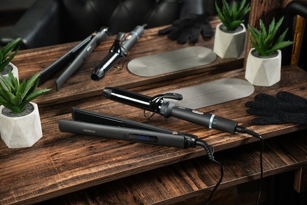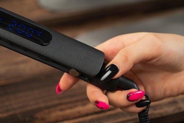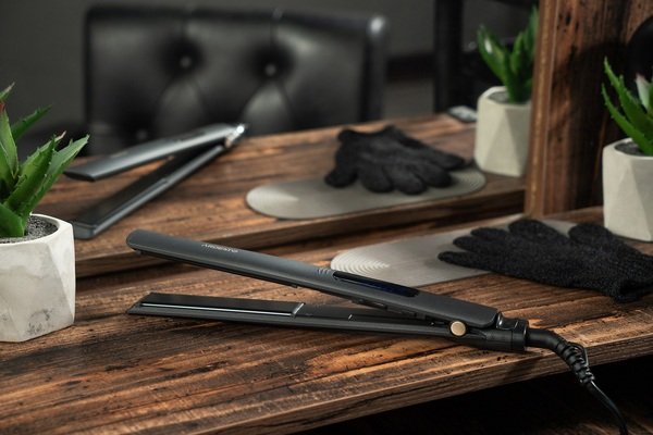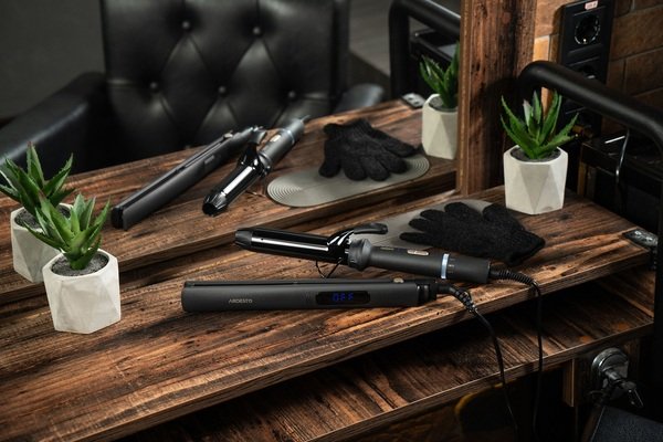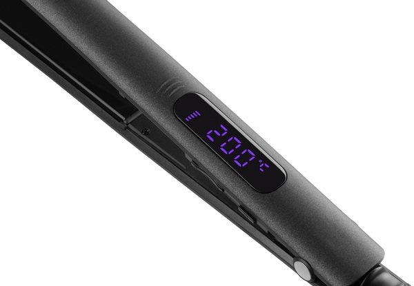 Плойка чорного кольору з керамічним покриттям та електронним керуванням для випрямлення волосся та створення локонів