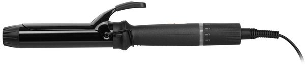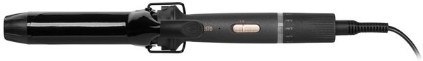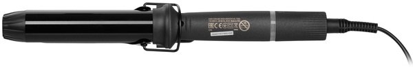 Пряма плойка чорного кольору із стильними золотистими елементами для створення горизонтальних локонів, природної хвилі, спіральних (вертикальних) локонів. Діаметр – 32 мм, керування – механічне.