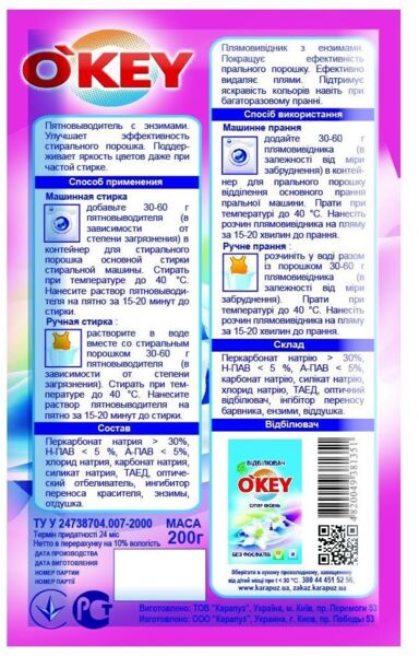 Плямовивідник з ензимами O'KEY чудово виводить навіть складні плями завдяки вмісту активного кисню та ензимів. Особливий інгібітор перенесення кольору не дає кольорам змішуватися. Водночас зберігає насиченість і яскравість відтінків. Засіб можна використовувати як для замочування, так і в процесі прання з пральним порошком. Можна користуватися для відпирання речей у пральних машинках усіх типів. Також підійде для ручного прання.