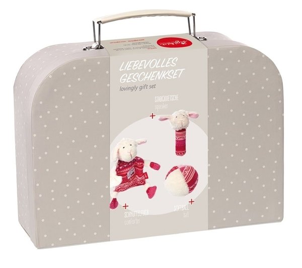 Це ідеальний подарунок на хрещення немовляти або просто для сім'ї, в якій тільки що з'явився новонароджений малюк. Набір містить 3 іграшки – м'який кульку, брязкальце та іграшку. Вони виготовлені в одній стилістиці, з зображенням милою овечки. Іграшки упаковані в красиву, вишукану валізу з ручкою.