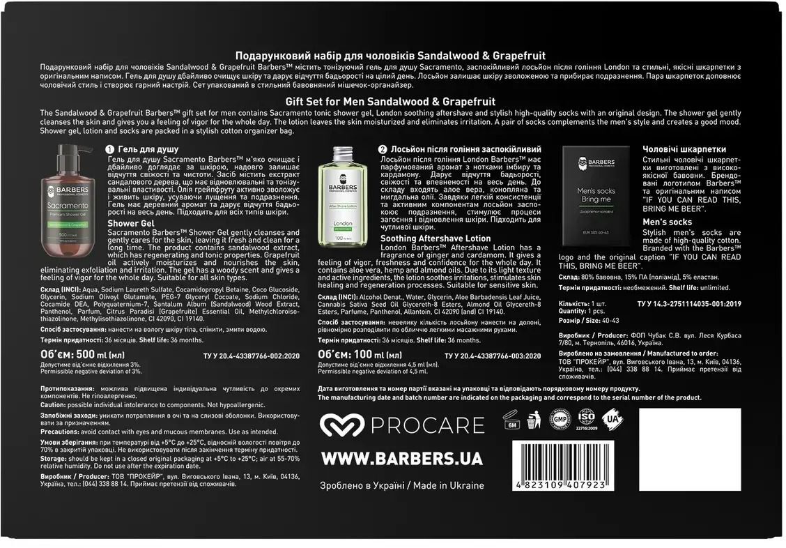 Подарунковий набір для чоловіків Sandalwood & Grapefruit Barbers містить тонізуючий гель для душу Sacramento, заспокійливий лосьйон після гоління London і стильні, якісні шкарпетки з оригінальним написом. Гель для душу дбайливо очищає шкіру і дарує відчуття бадьорості на цілий день. Лосьйон залишає шкіру зволоженою і усуває подразнення. Пара шкарпеток доповнює чоловічий стиль і створює гарний настрій. Набір упакований в стильний бавовняний мішечок-органайзер.