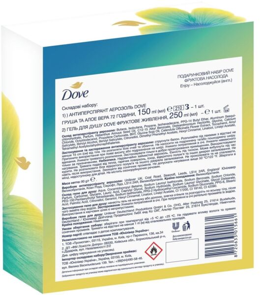 - Подарунковий набір Dove Фруктова Насолода Антиперспірант аерозоль 150 мл + Гель для душу 250 мл