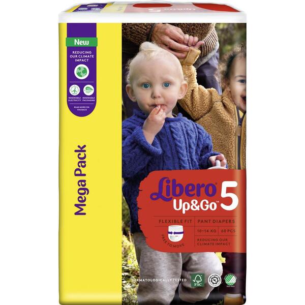 Підгузки-трусики Libero Up & Go чудово поглинають і не протікають завдяки поліпшеному вбираючому шару та високим бар'єрчикам навколо ніжок, залишаючи шкіру малюка сухою. Гнучка посадка трусиків забезпечує ніжне і надійне прилягання до животика малюка. Підгузки Libero м'які і тонкі, не містять лосьйонів. Вони розроблені таким чином, щоб дозволяти шкірі дихати і при цьому добре вбирають. У всіх підгузників-трусиків Libero Up & Go є спеціальна клеюча стрічка ззаду, яка допоможе Вам з легкістю компактно згорнути їх після використання.