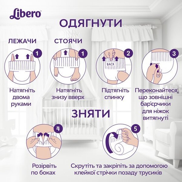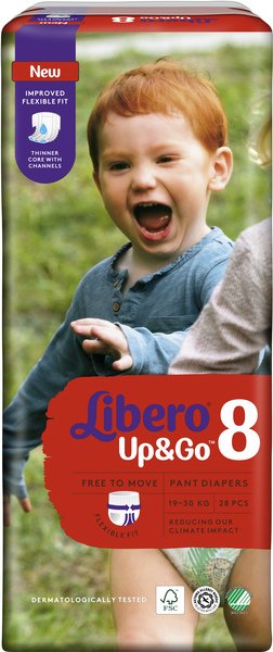 Підгузки-трусики Libero Up & Go чудово поглинають і не протікають завдяки поліпшеному вбираючому шару та високим бар'єрчикам навколо ніжок, залишаючи шкіру малюка сухою. Гнучка посадка трусиків забезпечує ніжне і надійне прилягання до животика малюка. Підгузки Libero м'які і тонкі, не містять лосьйонів. Вони розроблені таким чином, щоб дозволяти шкірі дихати і при цьому добре вбирають. У всіх підгузників-трусиків Libero Up & Go є спеціальна клеюча стрічка ззаду, яка допоможе Вам з легкістю компактно згорнути їх після використання.