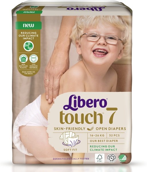 Libero Touch без лосьйонів пройшов дерматологічні тестування, сертифікований Nordic Swan Ecolabel і рекомендований Asthma Allergy Nordic. Крім того, його виготовлено з FSC-сертифікованої целюлози. Продовжуючи шлях зниження впливу Libero на клімат, понад 60% упаковки підгузків виготовлено з переробленого пластику. Ми додаємо поновлювані матеріали у виробництво підгузків, що допомагає знизити вуглецевий слід Libero. На фабриках з виробництва підгузків Libero використовується тільки сертифікована відновлювана електроенергія.