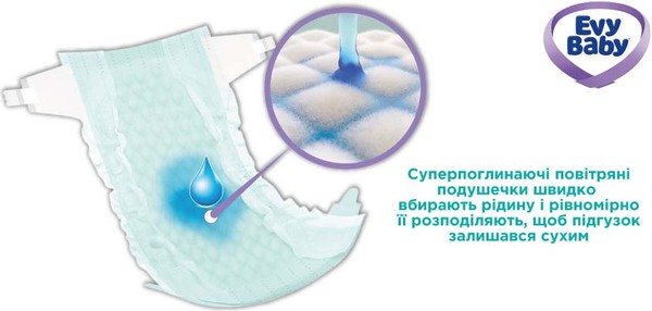 - М’які суперпоглинаючі повітряні подушечки. На внутрішній поверхні нових підгузків Evy Baby розташовані суперпоглинаючі повітряні подушечки, які швидко вбирають рідину і рівномірно її розподіляють, що допомагає підгузку залишатися сухим. М’який матеріал забезпечує делікатний догляд для чутливої шкіри та забезпечує комфорт вашому малюку.