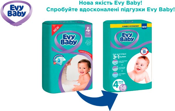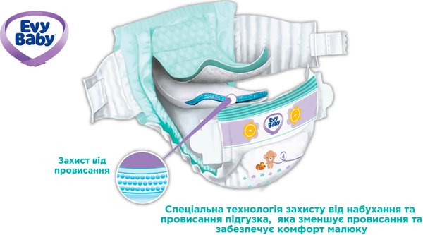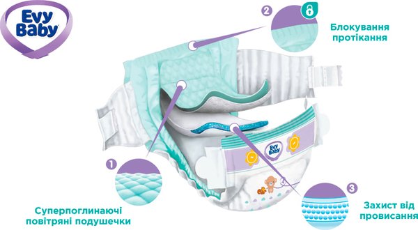Підгузки Evy Baby – це система повного догляду за ніжною шкірою малюка. Завдяки спеціальним суперпоглинаючим подушечкам підгузки Evy Baby забезпечують швидке поглинання та рівномірний розподіл рідини всередині підгузка. Захисна система від протікань блокує рідину всередині підгузків та забезпечує екстра сухість. Завдяки спеціальній структурі підгузків та використанню дихаючих матеріалів вони чудово сидять і оберігають шкіру вашого малюка.