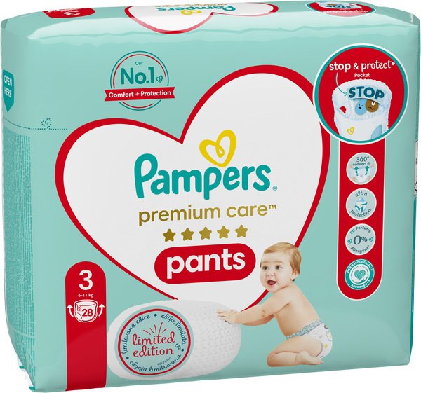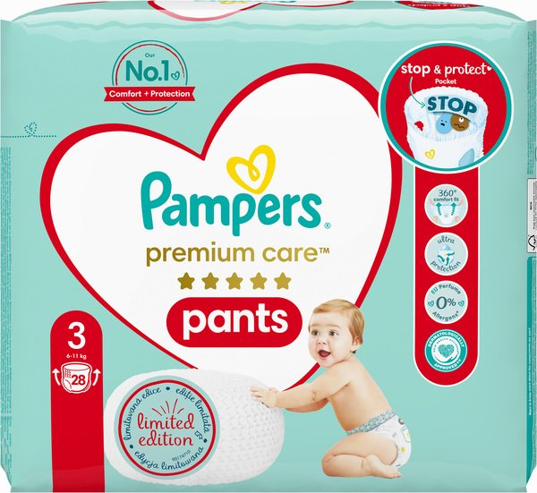 У міру того як ваш малюк стає більш активним, важливо, щоб трусики забезпечували комфортну посадку і надійний захист при будь-яких рухах. Ось чому трусики Pampers Premium Care Pants з технологією 3D Soft виготовлені з надм'яких і еластичних матеріалів, які повторюють форму тіла вашого рухливого малюка. Вони забезпечують всебічний захист від протікань до 12 годин, щоб ніщо не відволікало малюка від гри. Як будь-які трусики Pampers, трусики Pampers Premium Care Pants легко міняти: просто одягніть їх одним рухом, після використання розірвіть по боковому шву, щоб зняти трусики, згорніть їх і склейте стрічкою для легкої утилізації, навіть якщо ваш малюк активно рухається. Використовуйте в поєднанні з дитячими вологими серветками Pampers.
