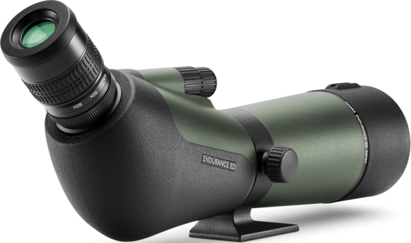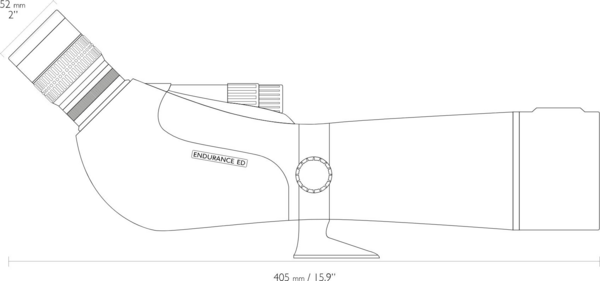 Окулярний вузол Hawke Endurance ED розташований під кутом 45º стосовно поздовжньої осі труби – це дуже зручно для спостережень у положенні лежачи та з настільних штативів. Корпус повертається навколо осі, встановлюється під будь-яким кутом і фіксується в кільці з розніманням для кріплення штатива. З цікавих рішень можна відзначити чіткі фіксовані положення труби при повороті навколо осі в точках 0, 45 і 90. Висувна сонцезахисна бленда захищає об'єктив від сонячних відблисків і від опадів. На захисній бленді знаходиться спеціальний цілік для попереднього наведення труби на ціль. Монтажна база труби адаптована під стандартне кріплення фотоштативу, тому пошук необхідної опори для спостереження - не є проблемою.