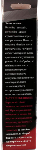 Поліроль від подряпин CarBI Scratch Away BI1002 - засіб, склад якого не включає силікон, що дозволяє йому відмінно видаляти дрібні та середні подряпини, будь-які забруднення і справлятися з потертостями. Його використання допустимо в домашніх умовах. Застосування не вимагає додаткових матеріалів і інструментів. CarBI Scratch Away BI1002 дозволить видалити забруднення всього за пару хвилин.