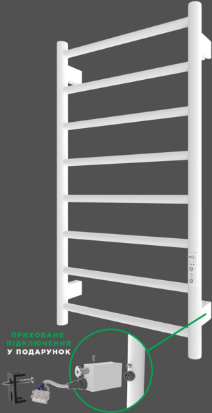 Рушникосушка обладнана вбудованим таймер-регулятором і конектором для підключення до живлення з будь-якого боку. Температурні режими таймер-регулятора: 40°C, 45°C, 50°C. Час роботи: 3, 6 годин або постійний нагрів.