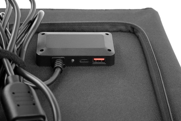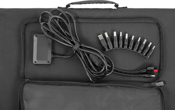 Зручно і корисно, що у комплекті йдуть майже всі необхідні кабелі та адаптери для підключення, виходи з різним вольтажем. Панель велика, важить майже 4 кг. У сонячний день, гарно заряджає, пробував на ноуті, смартфоні, павербанку, але коли похмура погода, то майже немає від нього користі, ледь ледь дає щось, ситуативна штука.