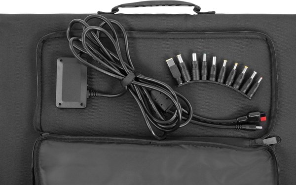 Панель собирается в форму портфеля, есть ручка, удобно транспортировать и перемещать. В живую больше, чем кажется на фото, ноутбук запитывает, мощности хватает. В комплекте есть много переходников, под любую модель можно найти. В перспективе хочу еще взять портативную станцию, проверить как быстро её зарядит.