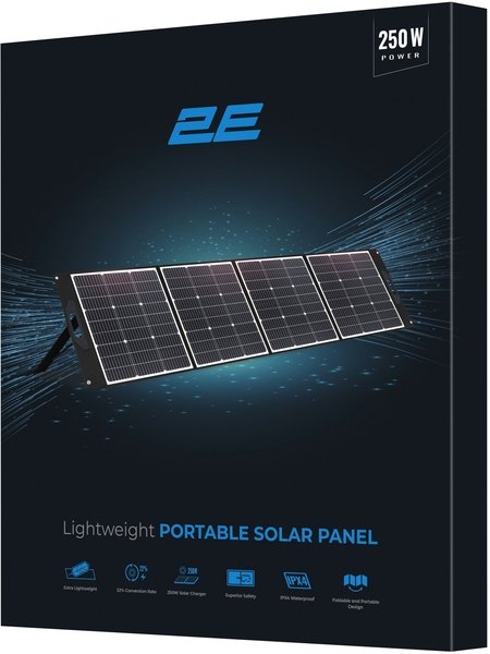 Панель має попит серед любителів активного відпочинку на природі, також буде корисна й для військових на фронті, адже забезпечує можливість відновлювати заряд важливих пристроїв на кшталт GPS-навігаторів, рацій, смартфонів, акумуляторних батарей тощо. Модель 2E-PSPLW250 має потужність 250 Вт, високий коефіцієнт конверсії на рівні 22-23,5 % і складається із чотирьох секцій. За ваги 6,12 кг розмір панелі становить 560 × 565 × 50 мм – доволі компактна й легко вміститься в туристичному рюкзаку. У розкладеному стані пристрій має значно більшу «робочу» поверхню – 3 035 × 560 × 25 мм, до того ж конструкцією передбачені зручні руків’я й опори для встановлення під оптимальним кутом нахилу.