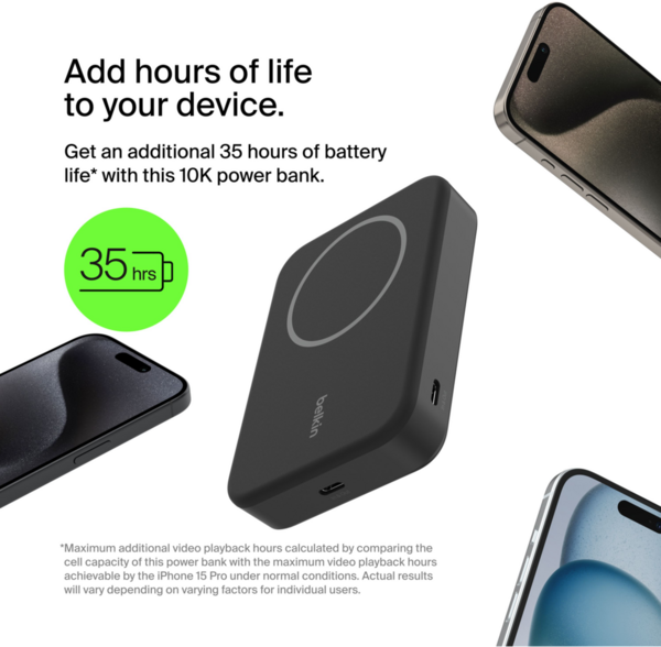 Використовуйте повербанк як портативний зарядний пристрій, щоб насолоджуватися перевагами швидкої бездротової зарядки Qi2. Отримайте додаткові 35 годин автономної роботи з цим павербанком на 10000 мАг.