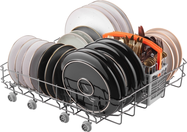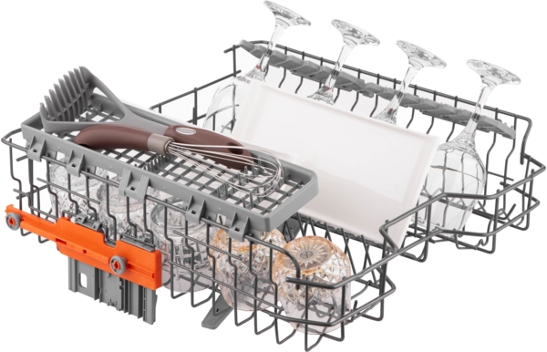 Правильне розміщення посуду в кошиках забезпечує ретельне його миття та захищає від можливих пошкоджень та впливає на те, скільки посуду можна помістити у посудомийку. Крім того, правильний розподіл посуду збереже працездатність пристрою. Для комфорту модель має: регульований дворівневий верхній кошик, 2 полиці для кухлів, 6 розкладних полиць у верхньому кошику, 4 розкладні полиці у нижньому кошику, цілісний знімний кошик для столових приборів. Особливістю пристрою є функція половинне завантаження з трьома режимами (Eco Wash), тож не потрібно чекати на повне завантаження. Додатковою опцією є відкладення старту 1 – 24 год.