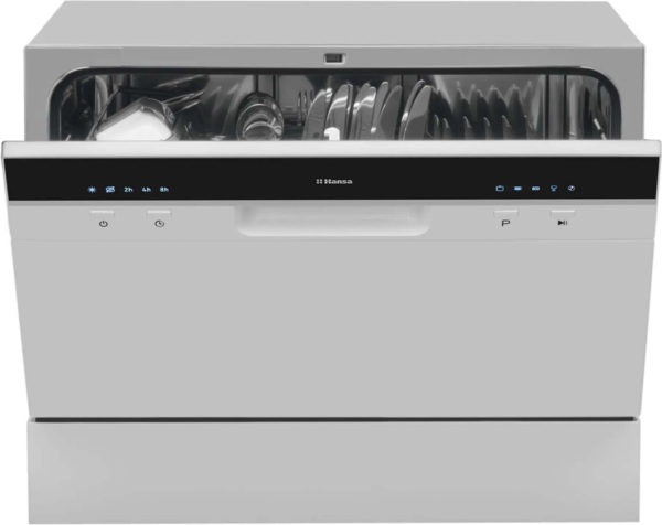 Посудомийна машина Hansa ZWM556SH має сучасний дизайн зі сріблястим корпусом та чорною панеллю керування у верхній частині. Широка ергономічна ручка дозволяє легко відкривати дверцята, навіть якщо машина встановлена не на рівні стільниці. Ця модель розрахована на завантаження 6 комплектів посуду.