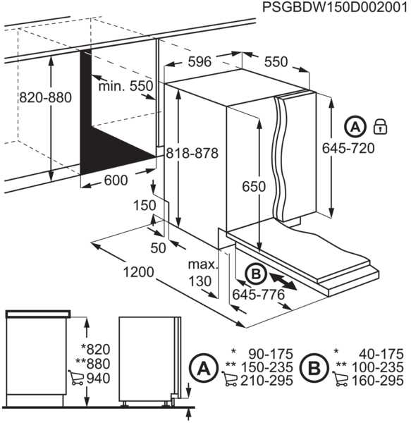 | Висота для вбудовування, мм | 820-880 |