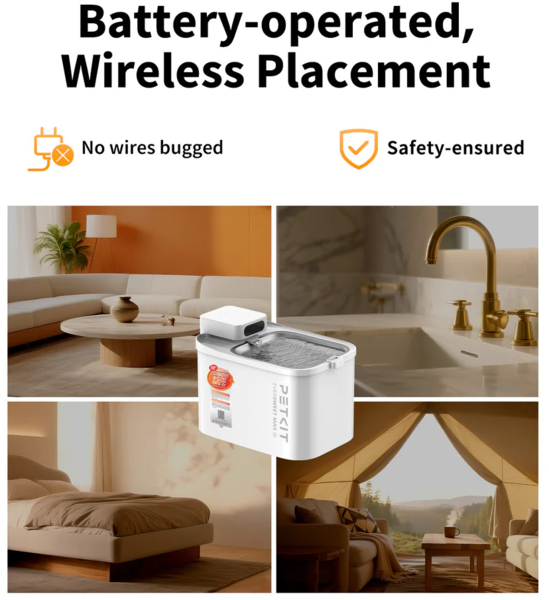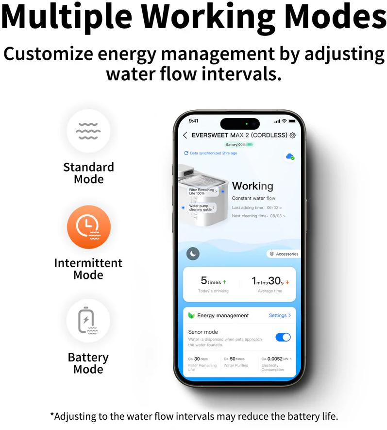 Поїлка для води для домашніх тварин Eversweet Max 2 оснащена бездротовим УФ-насосом, що виключає наявність оголених проводів і допомагає зменшити скупчення бактерій для більш безпечного напування. Виготовлена з термостійких матеріалів, придатних для миття в посудомийній машині, та піддону з нержавіючої сталі, стійкого до утворення біоплівки, міцна та проста в догляді. Завдяки трьом режимам пиття, моніторингу через додаток і 83 дням автономної роботи від батареї, він забезпечує чисте, зручне та надійне пиття для ваших улюбленців.