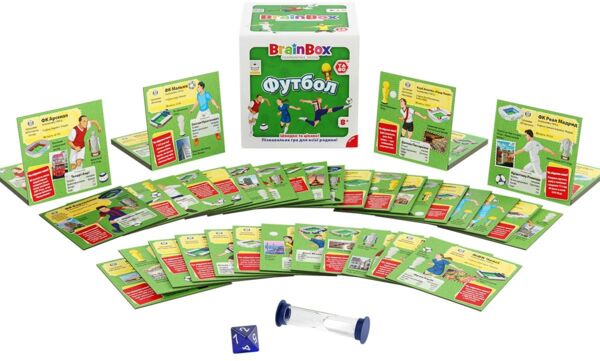 У грі «Футбол» ви знайдете 55 різних карток, в кожній з яких містяться цікаві факти про 55 різних футбольних команд! Уважно розглядайте їх, а потім спробуйте дати відповідь на 440 різних запитань, використовуючи лише власну пам’ять! Грайте та навчайтеся всією родиною разом з BrainBox!