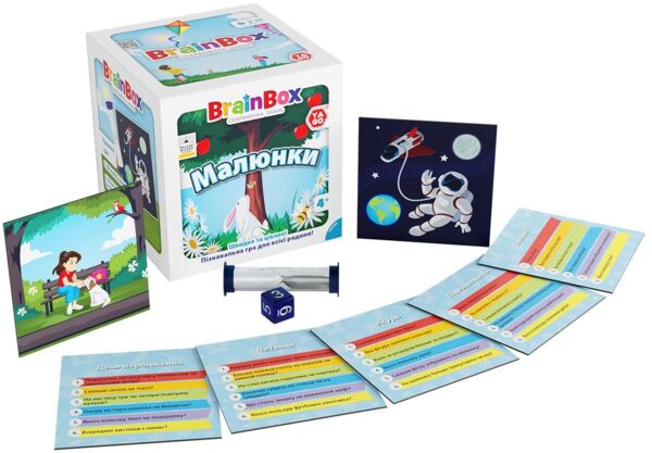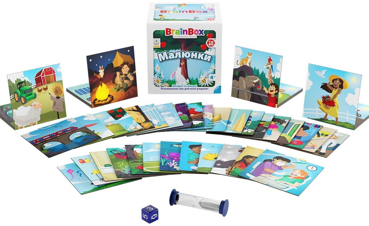 У наборі «Малюнки» ви знайдете 55 різноманітних карток на теми повсякденного життя, спорту, тварин та прогулянок на природі! Уважно розглядайте їх, а потім спробуйте відповісти на 330 різних запитань, використовуючи лише власну пам'ять! Грайте і вчіться всією сім'єю разом з BrainBox!