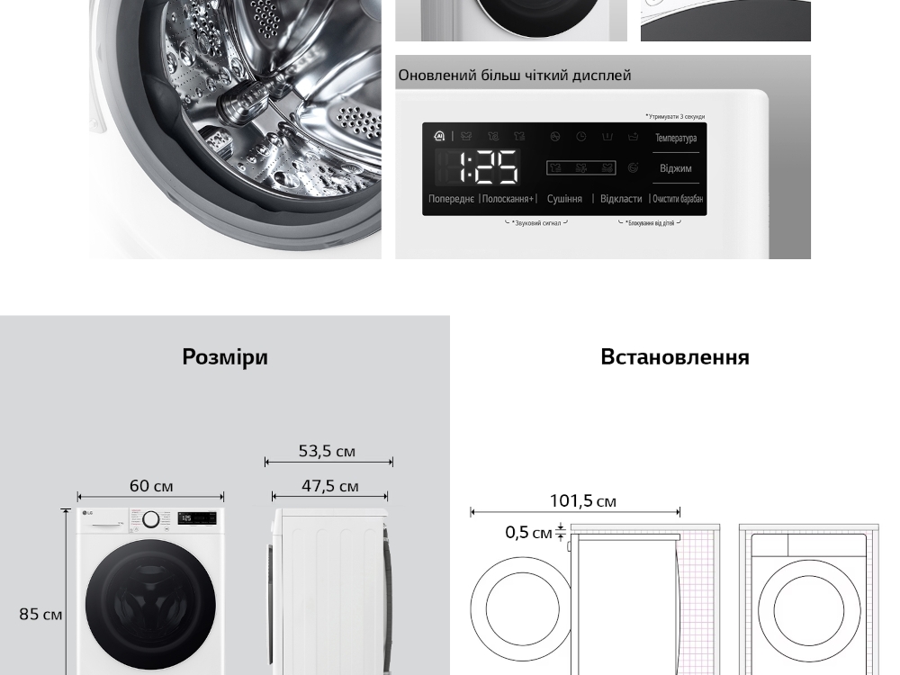 | Основні програми | Автоматичний, Антиаллергенна, Швидке прання, Делікатне прання, Щоденне прання, Полоскання + віджим, Прання+сушка, Сушка, Економічне прання ECO |