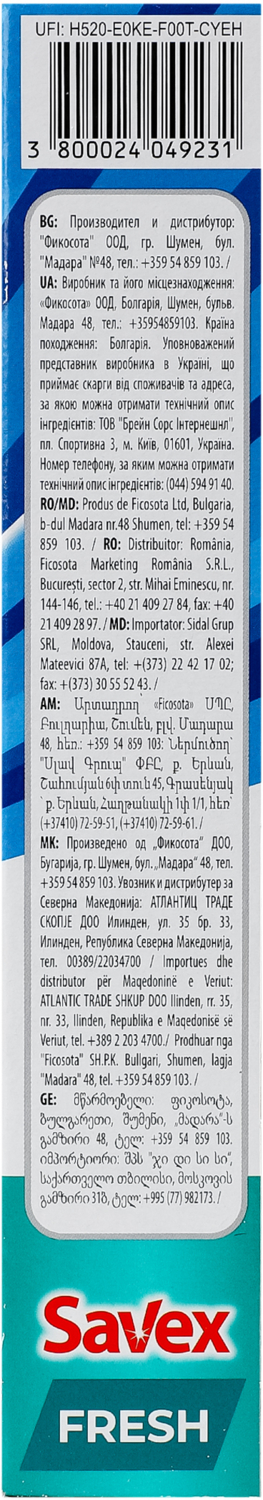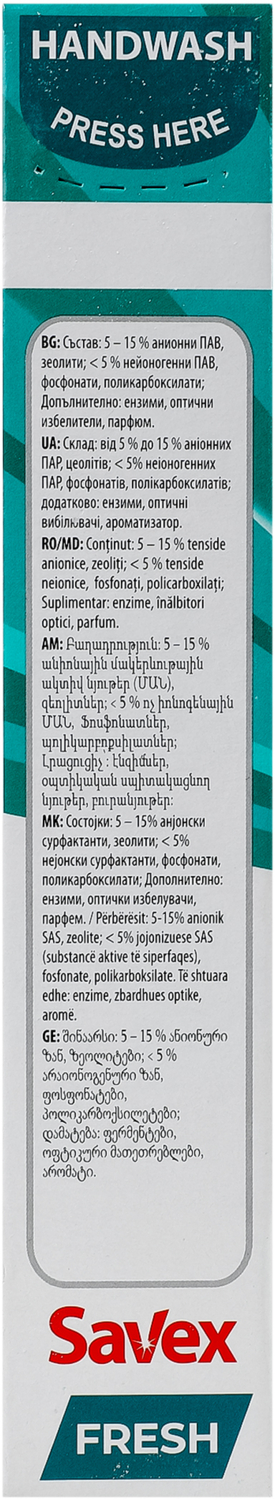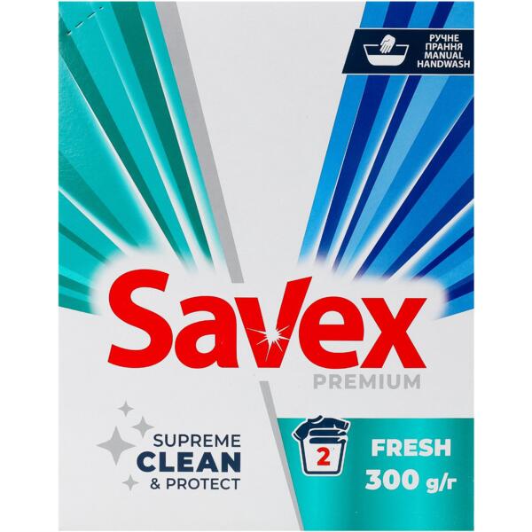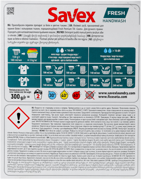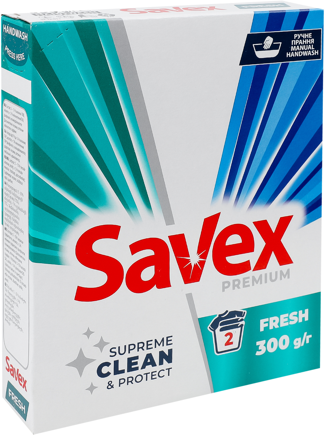 Savex Premium Fresh забезпечує чудові результати у видаленні плям та свіжий аромат, що тримається довго. Ефективне та просте рішення з суперефективною формулою прального порошку забезпечує бездоганну якість прання: ефективне видалення плям, турботу про тканину та її колір, і розкішний парфумований аромат. Savex піклується про тканини та яскравість кольорів прання за пранням.