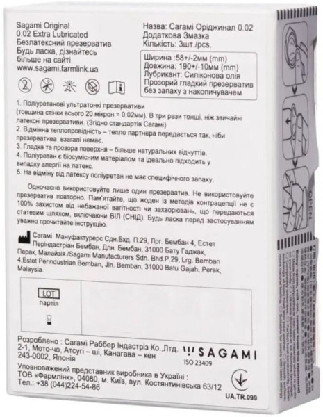 - Презервативи Sagami Original 0.02 поліуретанові Extra Lub 3 шт