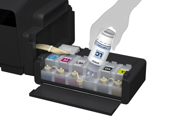 Замінити чорнило в Epson L1800 легко може навіть недосвідчений користувач. Причиною цього є зручний формфактор контейнерів для барвника. Контейнери з чорнилом оснащені спеціальним захисним механізмом, який запобігає протіканню.