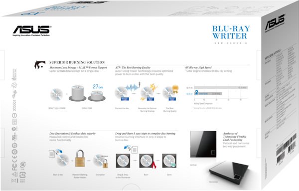 - Привід оптичний портативний ASUS SBW-06D2X-U Blu-ray Combo burner M-DISC USB2.0 чорний Retail Box Slim
