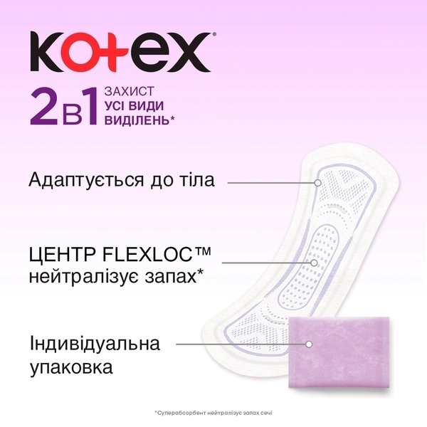 Щоденні прокладки Kotex 2in1 Extra Protect - захищають і за критичних днів, і за легкого ступеня нетримання.