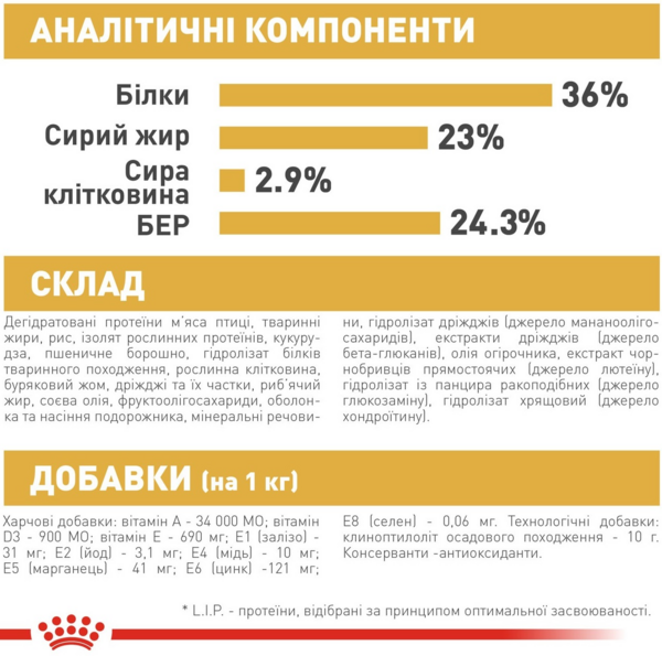 | Склад | Гідролізат з панцира ракоподібних (джерело глюкозаміну), гідролізат хрящовий (джерело хондроїтину)., Дегідратовані протеїни м'яса птиці, тваринні жири, рис, ізолят рослинних протеїнів, кукурудза, пшеничне борошно, гідролізат білків тваринного походження, рослинна клітковина, буряковий жом, дріжджі та їх частки, риб'ячий жир, соєва олія, фруктоолігонер речовини, гідролізат дріжджів (джерело маннаноолігосахаридів), екстракти дріжджів (джерело бета-глюканів), олія огірковика, екстракт чорнобривців прямостоячих (джерело лютеїну) |