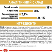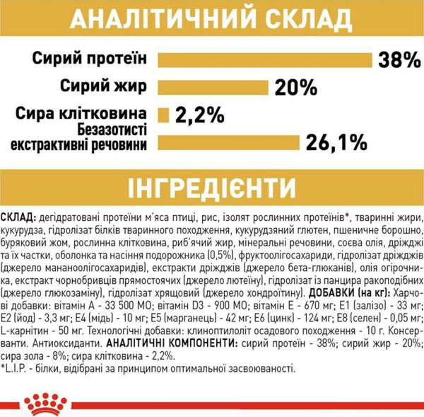 | Склад | Дегідратовані протеїни м'яса птиці, рис, ізолят протеїнів рослинного походження, тваринні жири, кукурудза, гідролізат білків тваринного походження, кукурудзяний глютен, пшеничне борошно, буряковий жом, рослинна клітковина, риб'ячий жир, мінеральні речовини, соєва олія та насіння подорожника (0,5%), фруктоолігосахариди, гідролізат дріжджів (джерело маннанолігосахаридів), екстракти дріжджів, олія огірковика, екстракт чорнобривців прямостоячих |