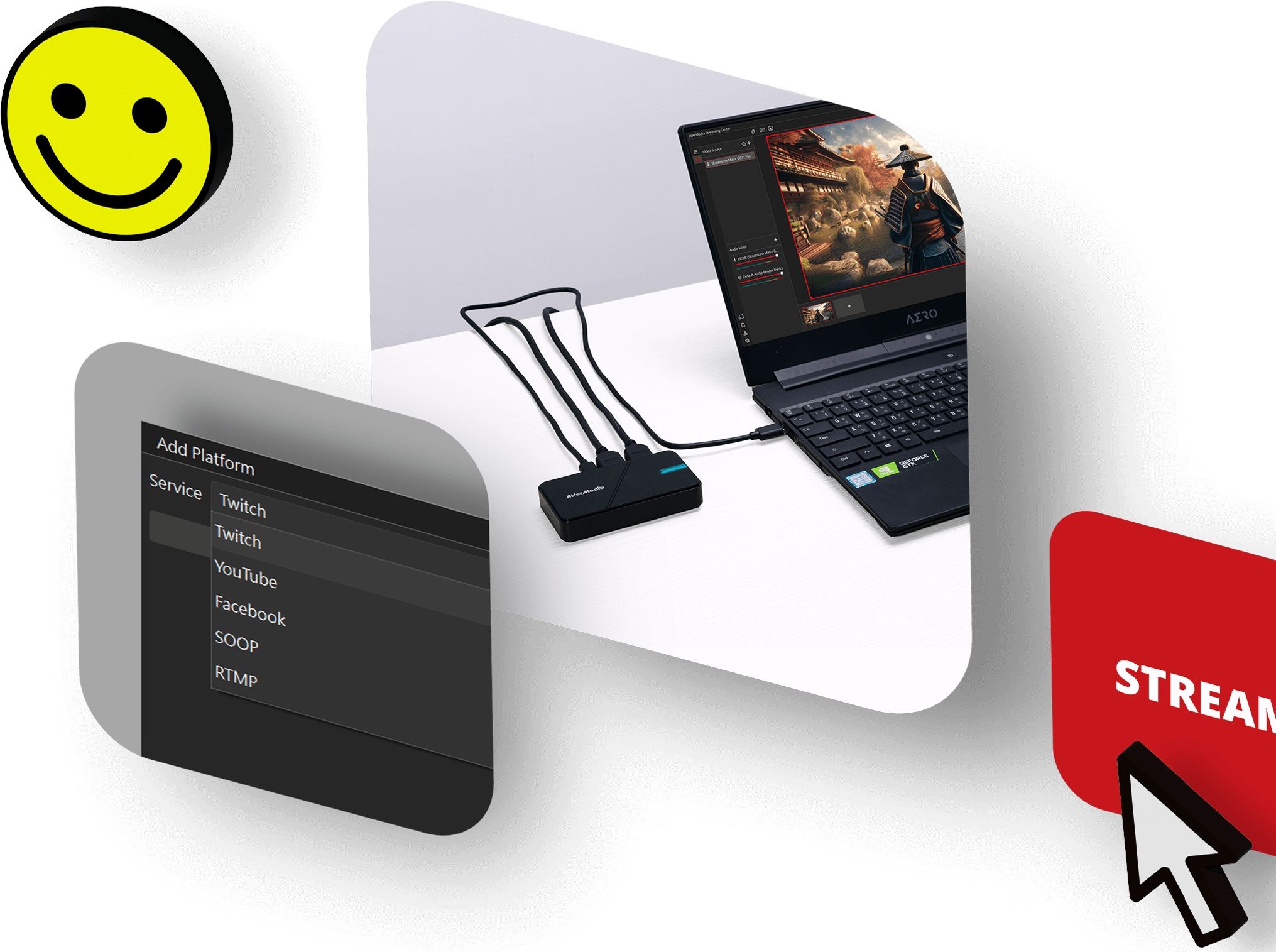 Просто підключіть, увійдіть і натисніть кнопку "Стрім". StreamLine MINI+ з програмним забезпеченням Streaming Center дозволяє легко транслювати ваш контент усьому світу. Без громіздких інструкцій. Без технічного жаргону. Без клопоту.