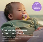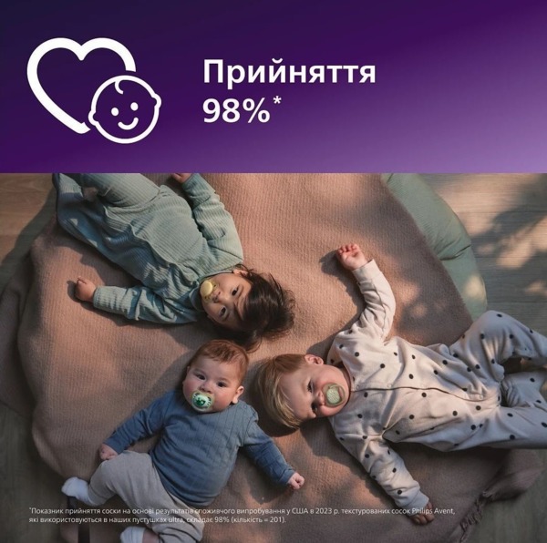 Текстуровані силіконові пустушки імітують відчуття материнських грудей. У середньому 98% батьків відзначають, що їхні діти приймають пустушки Philips Avent.