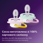 Ортодонтичні пустушки виготовлені з м’якого силікону, щоб підтримувати природні рухи ротових м’язів та здоровий розвиток ротової порожнини дитини. Звужена основа зменшує тиск між язиком та піднебінням. Пустушки Philips Avent Ultra мають незалежну акредитацію Фонду стоматологічного здоров’я (Oral Health Foundation). Виготовлені зі 100% харчового силікону, а також не містять BPA, BPS, фталатів, ПВХ та поліциклічних ароматичних вуглеводнів.