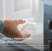 Футляр для зберігання також виконує функцію стерилізатора, тому пустушки завжди готові до використання. Просто додайте воду та поставте в мікрохвильовку на 3 хвилини для швидкої стерилізації, яка забезпечує до 50% менше викидів CO₂ порівняно з традиційними методами.