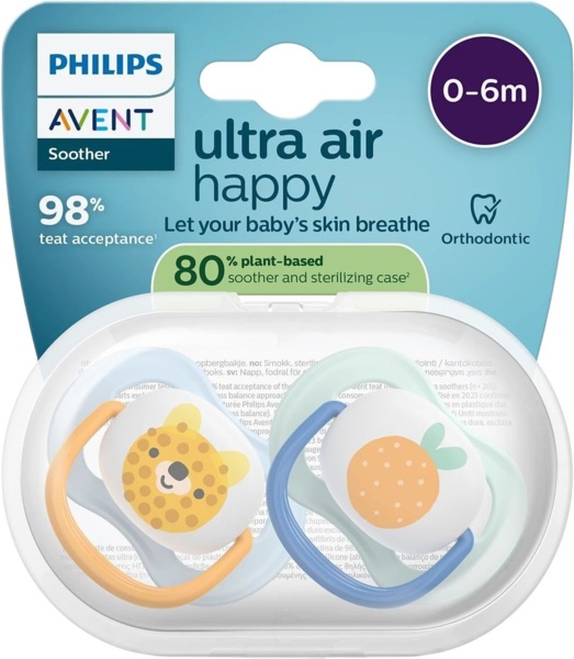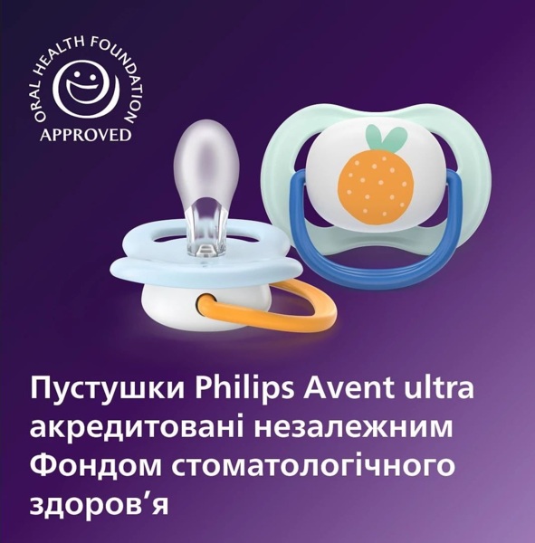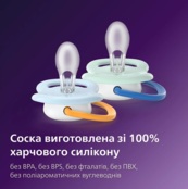 Ортодонтичні пустушки виготовлені з м’якого силікону, щоб підтримувати природні рухи ротових м’язів та здоровий розвиток ротової порожнини дитини. Звужена основа зменшує тиск між язиком та піднебінням. Пустушки Philips Avent Ultra мають незалежну акредитацію Фонду стоматологічного здоров’я (Oral Health Foundation). Виготовлені зі 100% харчового силікону, а також не містять BPA, BPS, фталатів, ПВХ та поліциклічних ароматичних вуглеводнів.