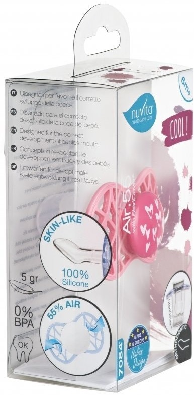 Пустушка ортодонтична Nuvita NV7084 Air55 Cool 6m+ «сердечка» рожева. Платівка соски на 55% складається з повітря, забезпечуючи майже повну аерацію ділянки навколо рота, уникаючи скупчення слини, яка може подразнювати шкіру. Захисний ковпачок для соски для підтримання чистоти соски та стерилізації в мікрохвильовій печі простим додаванням води.