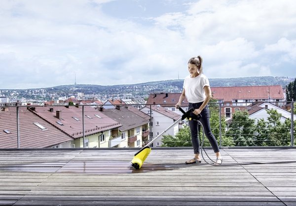 Апарат для чищення терас Karcher PCL 4 дозволяє легко, ретельно і рівномірно видаляти стійкі забруднення з різних зовнішніх поверхонь. Просто підключіть очищувач внутрішніх двориків до садового шлангу і почніть очищення. Комбінація двох обертових і змінних роликових щіток, а також можливість регулювати подачу води забезпечують одночасно надійне відшарування і видалення бруду. Це означає, що внутрішні дворики можна ретельно очистити в найкоротші терміни і без використання більшої кількості води, ніж потрібно, щоб очистити. Ширина і положення роликів розраховані на те, щоб дві дошки можна було очистити до країв за один крок, що також економить час. Завдяки легко замінним роликовим щіток цей апарат можна використовувати не тільки для дерев'яних поверхонь і ДПК, але також для ретельної і дбайливого очищення всіх кам'яних поверхонь навколо будинку.