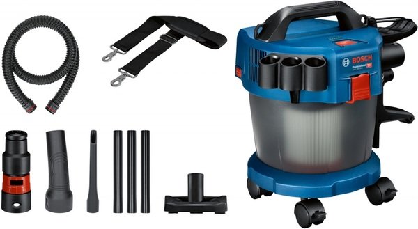 Акумуляторний пилосос GAS 18V-10 L - чудове мобільне рішення для підтримки робочого місця в чистоті. Цей пилосос призначений для сухого та вологого прибирання, що дає змогу працювати не тільки з сухими матеріалами (пил, стружка, тирса тощо), а й швидко збирати воду. Технологія Rotational Airflow (повітря, що обертається) підтримує постійну силу всмоктування під час роботи. Напівпрозорий контейнер допомагає контролювати його заповнення, а дві зручні засувки на корпусі дають змогу відстебнути його і витрусити всього за кілька секунд. Конструкцію пилососа продумано до дрібниць - аксесуари та шланг закріплюються безпосередньо на корпусі, і водночас не заважають під час перенесення. Акумулятор надійно захищений кришкою, що приховує його від пилу та інших дрібних частинок, які можуть негативно позначитися на роботі інструменту. А щоб не довелося відкривати кришку і перевіряти заряд, що залишився на акумуляторі, - на корпусі розташовується інформативний індикатор заряду, який завжди підкаже, коли слід замінити акумулятор. Широкий набір аксесуарів у комплекті перетворюють роботу з пилососом на одне задоволення: підлогова насадка, щілинна насадка та подовжувальні трубки - дають змогу очистити будь-яке місце. Особливу увагу варто приділити підлоговій насадці преміального рівня - м'які щіточки захищають дерево від подряпин, коліщата дають змогу легко керувати насадкою, а гумовий ущільнювач чудово збирає воду і дрібні частинки пилу та тирси. Пилосос можна встановити як стаціонарно, так і возити за собою завдяки 4 коліщаткам у комплекті. А якщо необхідно працювати на висоті - ремінь дає змогу повісити пилосос на плече і комфортно працювати навіть під стелею. Час роботи на одному акумуляторі становить приблизно 4 хвилини на кожен Ач. GAS 18V-10 L входить до акумуляторної сім'ї Bosch Professional 18V і сумісний з усіма акумуляторами з цієї лінійки.