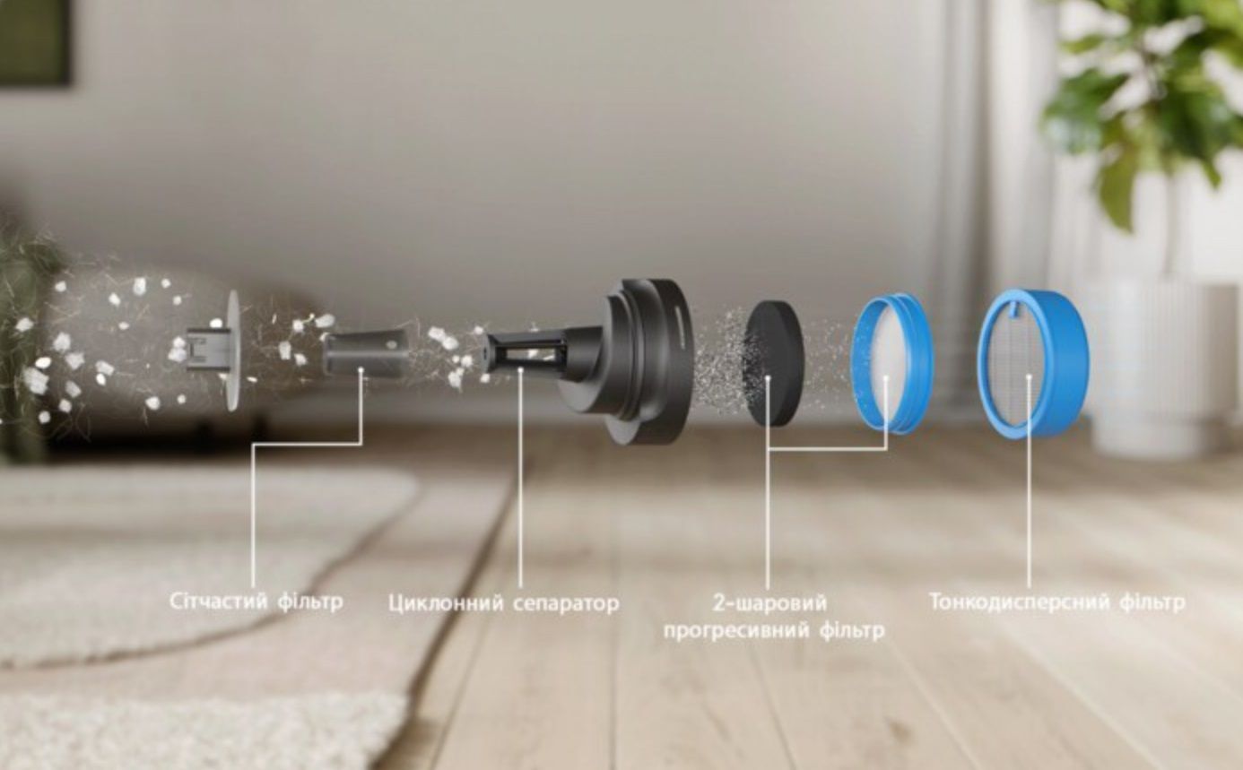 Вдосконалений циклонний сепаратор зводить до мінімуму засмічення фільтра, забезпечуючи стабільно оптимальну роботу. Збільшена до 2 разів ефективність всмоктування до заміни фільтра.