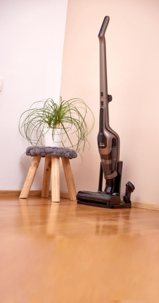 Пилосос може стояти вертикально самостійно, однак його також можна закріпити й зарядити на станції для закріплення, де акуратно зберігаються всі насадки. Якщо ви бажаєте прибрати прилад із поля зору, складіть ручку та розмістіть його в шафі.