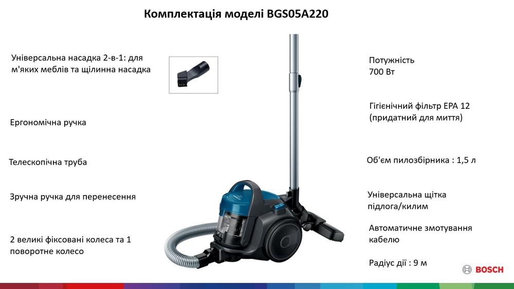 | Насадки | Підлога-килим, Щілинна насадка, Щітка для пилу |