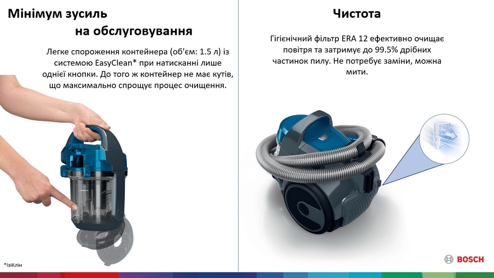 | Додатково | Побутові пилососи BOSCH , Недорогі пилососи, Потужні пилососи, Безмішкові пилососи, Потужні пилососи без мішка, Потужні побутові пилососи, Пилососи без мішка BOSCH |