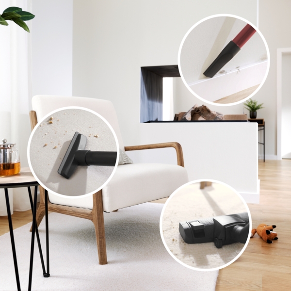 Спростіть своє прибирання за допомогою інтегрованого рішення для аксесуарів. Насадки для щілин і оббивки зберігаються безпосередньо в пилососі, гарантуючи, що необхідні аксесуари завжди будуть під рукою. Легко переходьте від одного завдання з прибирання до іншого, легко й ефективно виконуючи ретельне прибирання.