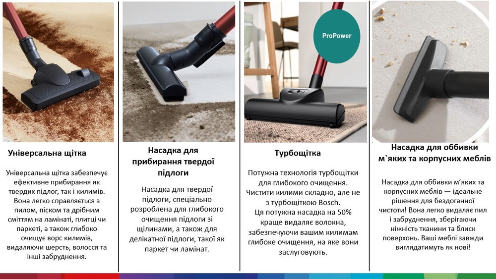 | Насадки | Насадка для меблів, Насадка для підлоги, Підлога-килим, Турбощітка (для прибирання волосся та шерсті), Щілинна насадка |